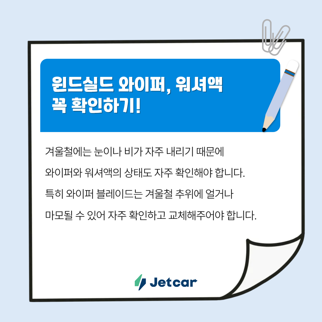 겨울철에는 눈이나 비가 자주 내리기 때문에 와이퍼와 워셔액의 상태도 체크해야 합니다. 와이퍼 블레이드는 겨울철 추위에 얼거나 마모될 수 있어 자주 교체해주어야 합니다. 또한 워셔액은 겨울철에는 얼지 않도록 겨울용 워셔액을 사용하는 것이 좋습니다. 워셔액이 부족하거나 얼어버리면 시야 확보에 어려움을 겪을 수 있기 때문에 이를 항상 체크하고 보충해주는 것이 중요합니다.