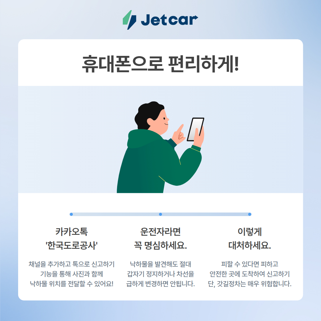 낙하물을 신고하는 작은 행동 하나가 여러분뿐 아니라 많은 운전자의 안전을 지킬 수 있습니다. 오늘 운전도 안전하게, 그리고 다른 운전자의 안전도 함께 챙기며 멋진 운전자로 남아봐요🚘