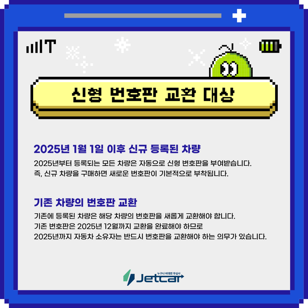 2025년 1월 1일 이후 신규 등록된 차량: 2025년부터 등록되는 모든 차량은 자동으로 신형 번호판을 부여받습니다. 즉 신규 차량을 구매하면 새로운 번호판이 기본적으로 부착됩니다.