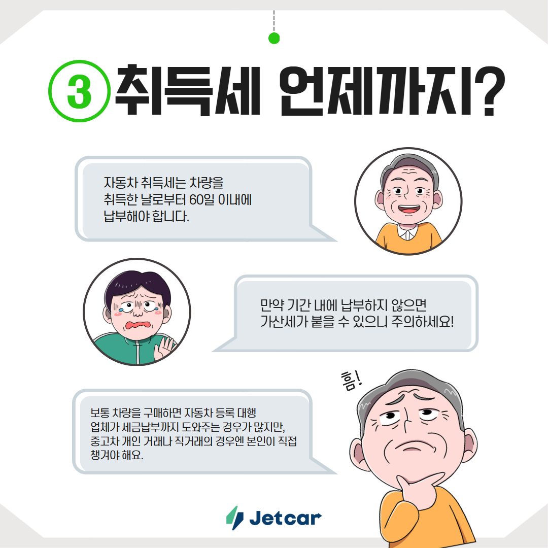 자동차 취득세는 차량을 취득한 날로부터 60일 이내에 납부해야 합니다. 만약 기간 내에 납부하지 않으면 가산세가 붙을 수 있으니 주의하세요!
