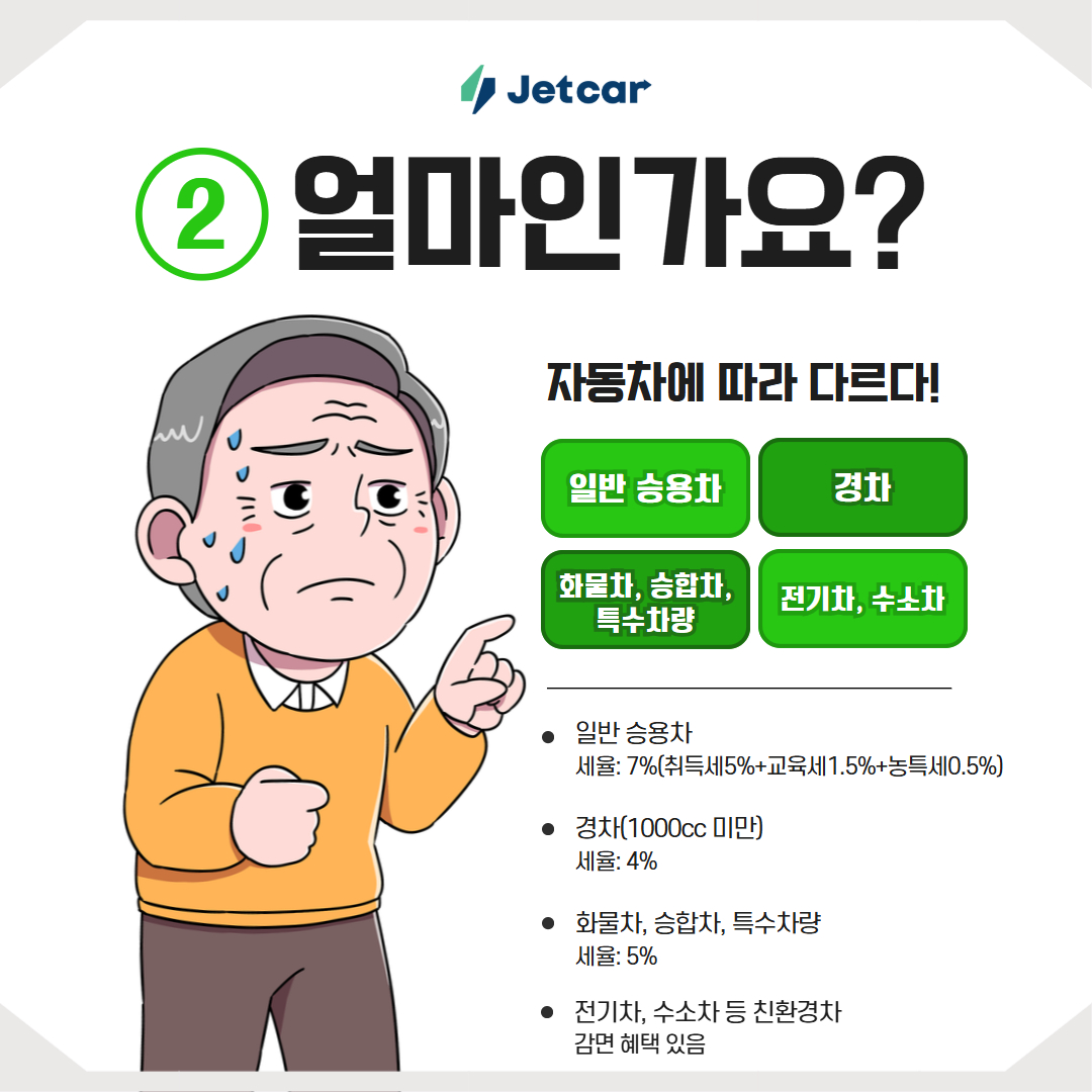 예를 들어, 차량 가격이 3,000만 원인 경우: 취득세 5% = 150만 원, 교육세 1.5% = 45만 원, 농특세 0.5% = 14만 원