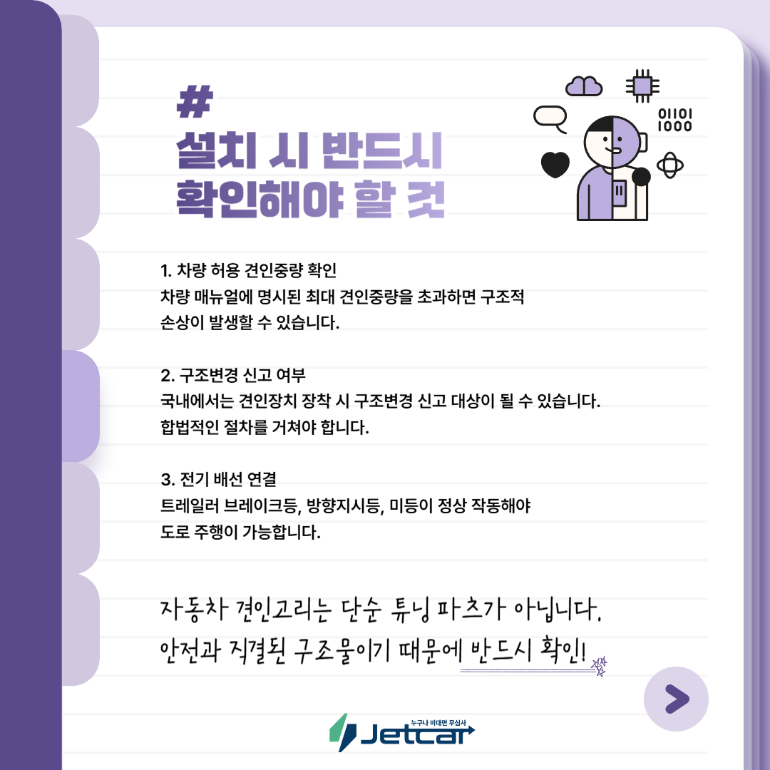 예를 들어, 소형 SUV와 대형 SUV의 견인 가능 중량은 다릅니다. 차량 구조(모노코크.바디온프레임)에 따라 견인 강성도 차이가 있습니다. 견인볼과 히치 구조가 정확하게 체결되지 않으면, 주행 중 이탈 위험이 있습니다. 그래서 반드시 차량 규격에 맞는 제품을 선택해야 합니다.